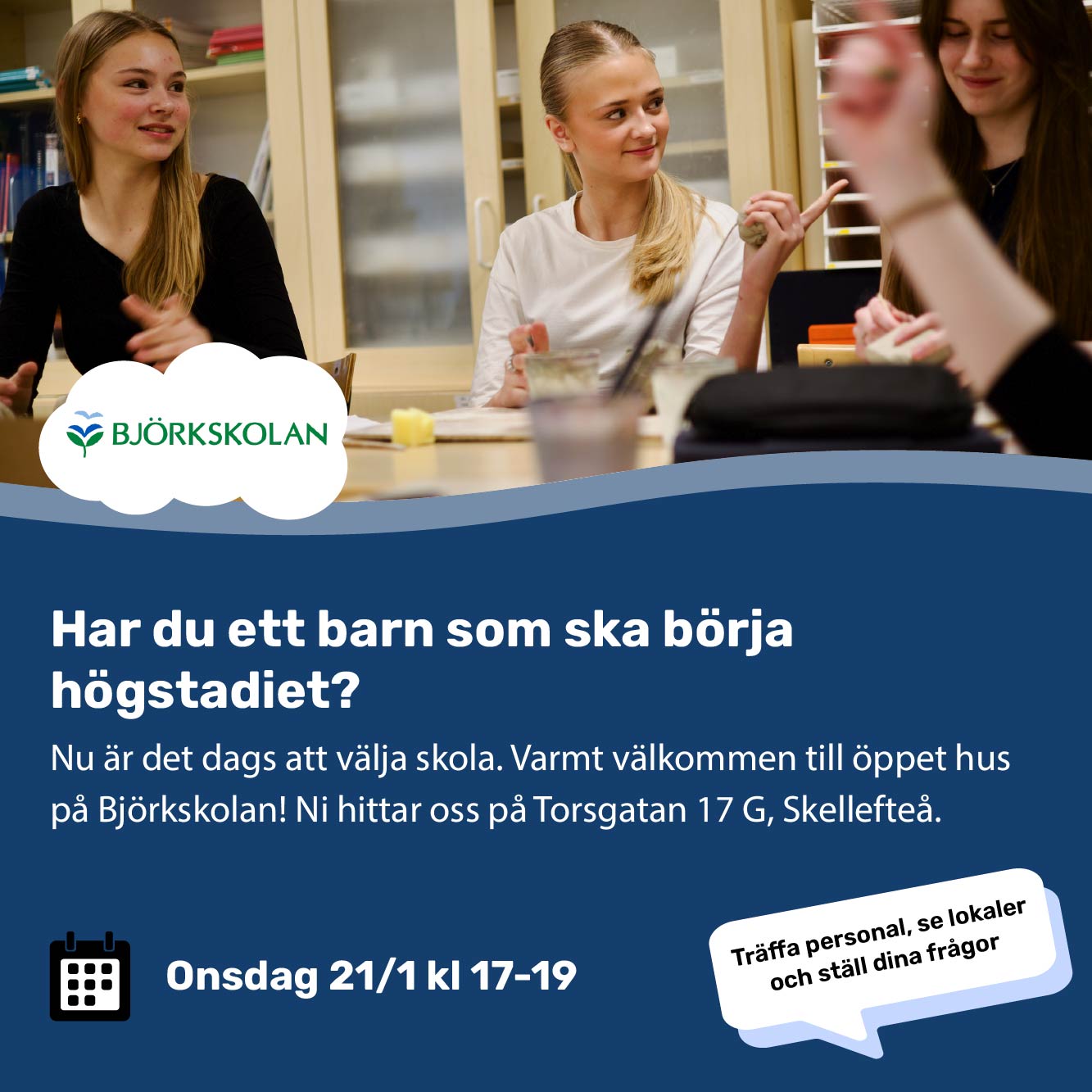 Björkskolan är den lilla skolan som erbjuder en kreativ och trygg studiemiljö. Vi betonar alla människors lika värde och värnar om barns olikheter samt arbetar utifrån en kristen värdegrund. Vårt mål är att alla ska få utvecklas. Just nu har vi drygt 90 elever i årskurs 6-9.
